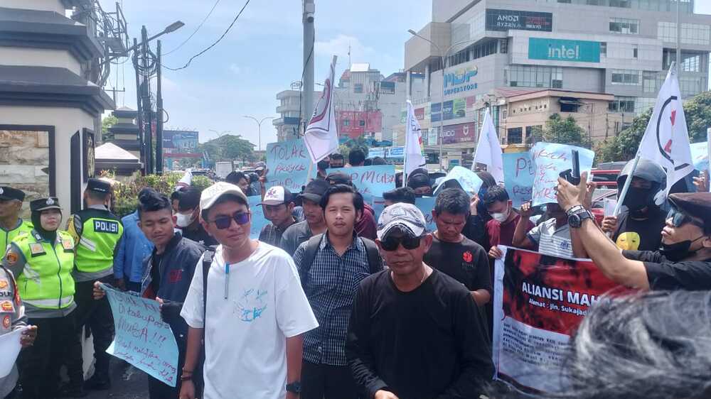 Ratusan massa aksi yang tergabung dalam Aliansi Mahasiswa, Ormas dan Lembaga Sumatera Selatan mendatangi Mapolda Sumsel melakukan aksi demontrasi.--istimewa