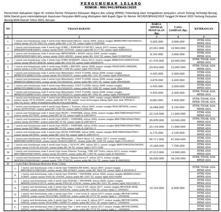 PENGUMUMAN! Pemkab Ogan Ilir Lelang Puluhan Kendaraan Dinas, Harga Mulai Rp 4 Jutaan, Cek Syarat-Syaratnya.-koranpalpres.com-
