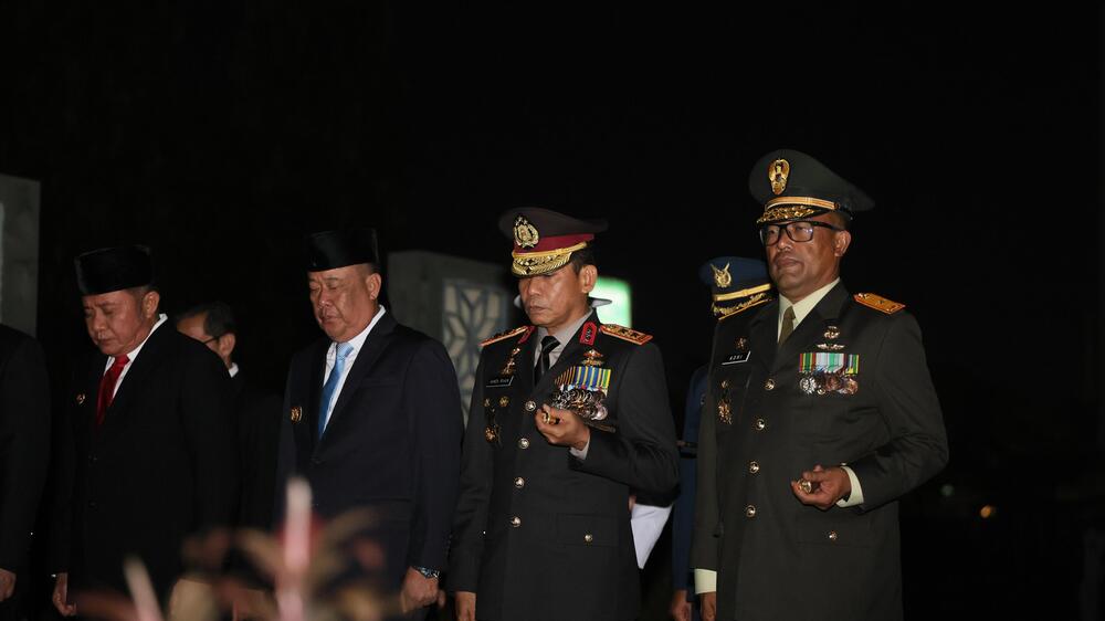 PALEMBANG, KORANPALPRES.COM - Kapolda Sumsel Irjen Pol Andi Rian R Djajadi, S.I.K., M.H bersama Forkopimda Sumsel hadirin pelaksanaan Apel Kehormatan dan Malam Renungan Suci di Taman Makam Pahlawan (TMP) Kesatria Ksetra Siguntang, Sabtu 16 Agustus 2025.