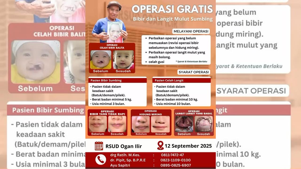 "Selain itu perbaikan operasi langit mulut yang masih bolong, dan celah gusi. Ini syarat dan ketentuan berlaku," ungkap Dirut RSUD Ogan Ilir dr Zulfitri, Rabu 03 September 2025.