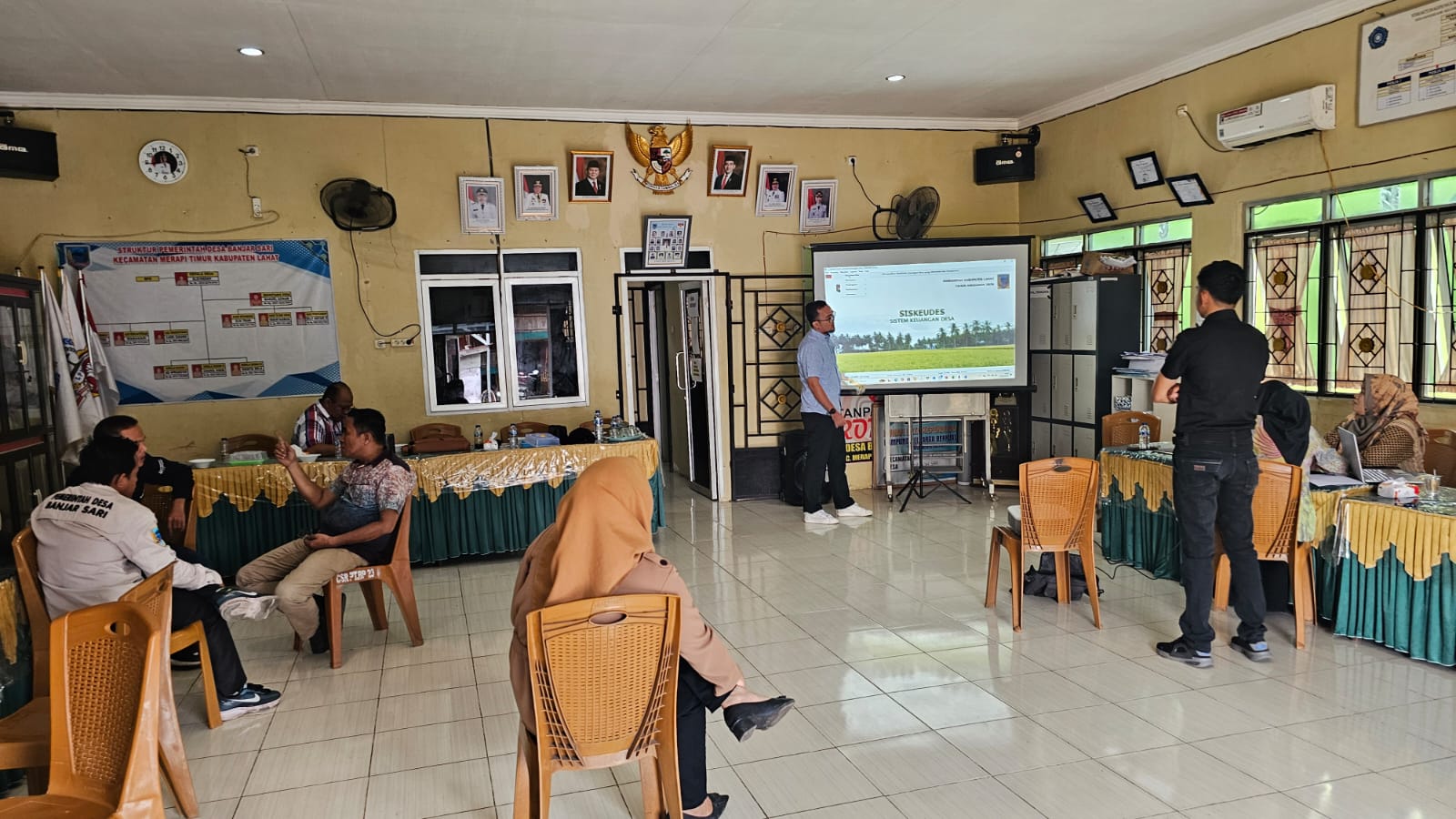 PEMBINAAN : Kades Banjarsari, Kecamatan Merapi Timur, Aldiansah didampingi Narasumber dari DPMDes Lahat, memberikan pembinaan terhadap perangkat desa baru saja dilantik-Pemdes Banjarsari Lahat/koranpalpres.com-
