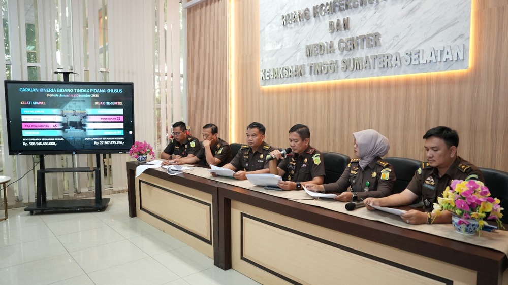 Adapun capaian kinerja bidang Pidsus Periode Januari-Desember 2025 yakni Kejati sumsel, penyelidikan 11 kasus, penyidikan 34 kasus, pra penuntutan 45 kasus dengan penyelamatan keuangan negara mencapai Rp588.146.486.000.